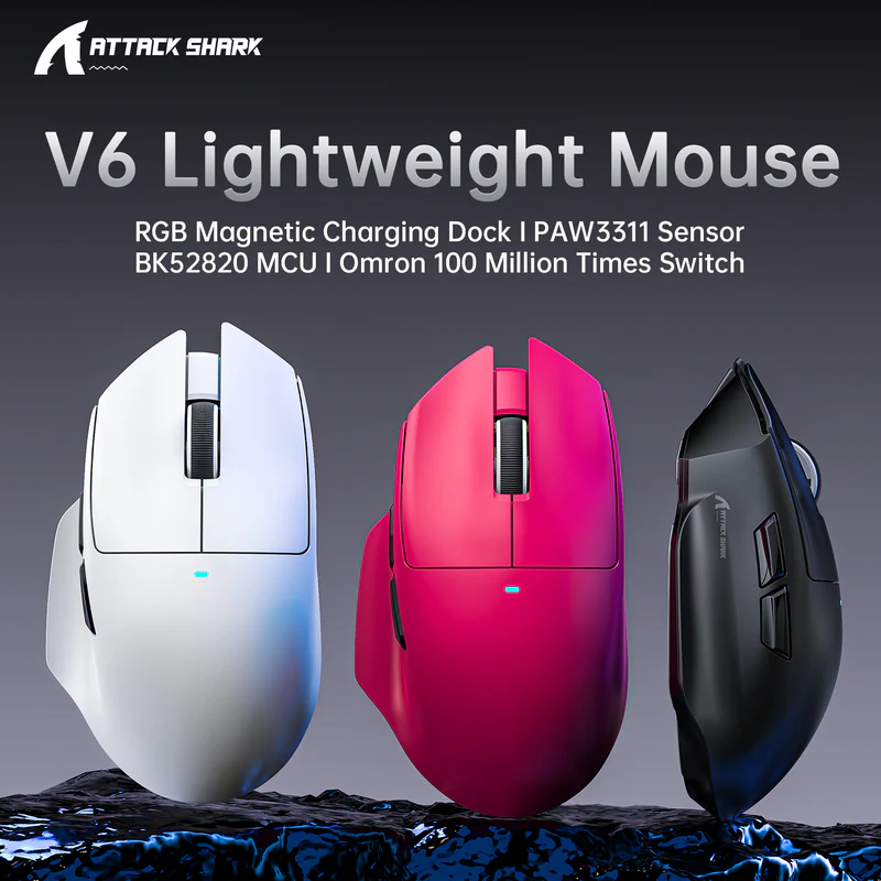 The ATTACK SHARK V6 Ultra-Light Tri-Mode Gaming Mouse (White) is built for competitive gamers who want precision performance, flexible connectivity, and a clean, modern desk aesthetic. Powered by the high-performance PixArt PAW3311 gaming sensor and an upgraded Broadcom BK52820 core chip, the V6 delivers accurate tracking, ultra-low latency, and efficient power management across wired, 2.4GHz wireless, and Bluetooth modes.