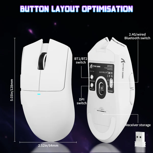 The Attack Shark X11SE is a high-performance wireless gaming mouse designed for speed, precision, and versatility. Weighing just 59g, it features a PixArt PAW3311 optical sensor, BK52820 tri-mode chip, and durable HUANO 20 million-click switches. Whether you’re playing competitively or working across multiple devices, this ultra-light mouse gives you a serious edge.