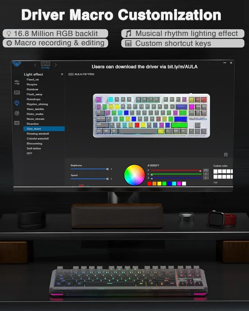 The AULA F87 Pro Black Gradient is a premium compact mechanical keyboard built for gamers and professionals who want smooth keystrokes, flexible wireless modes, and eye-catching RGB in a refined gradient design.