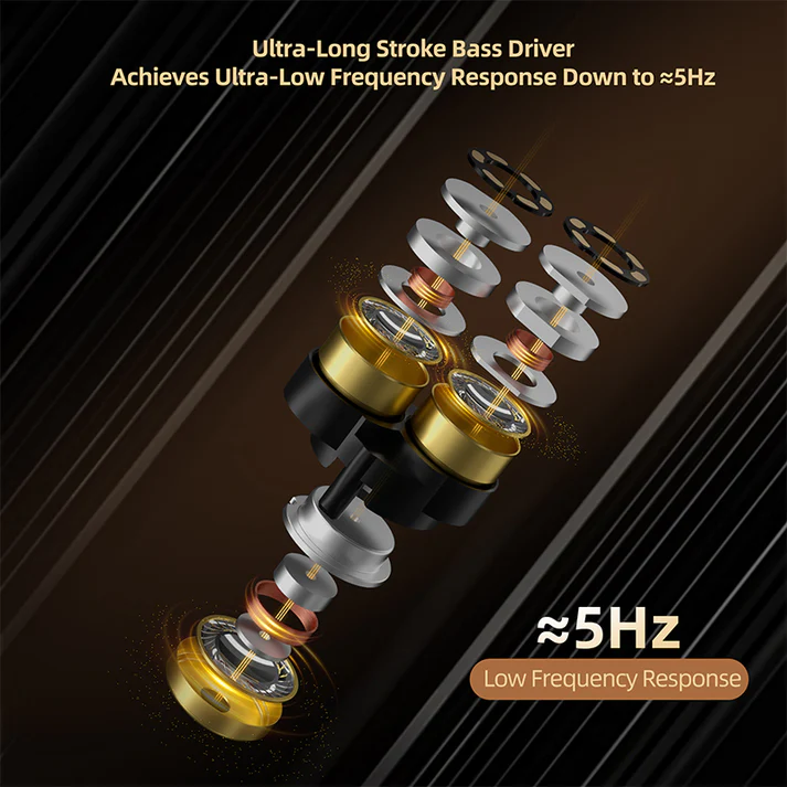 ✔ Ultra-long stroke bass driver with ≈5Hz low-frequency extension.